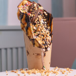 Soft vanilla ice cream mixed with hot chocolate, fudge, cookies and peanuts